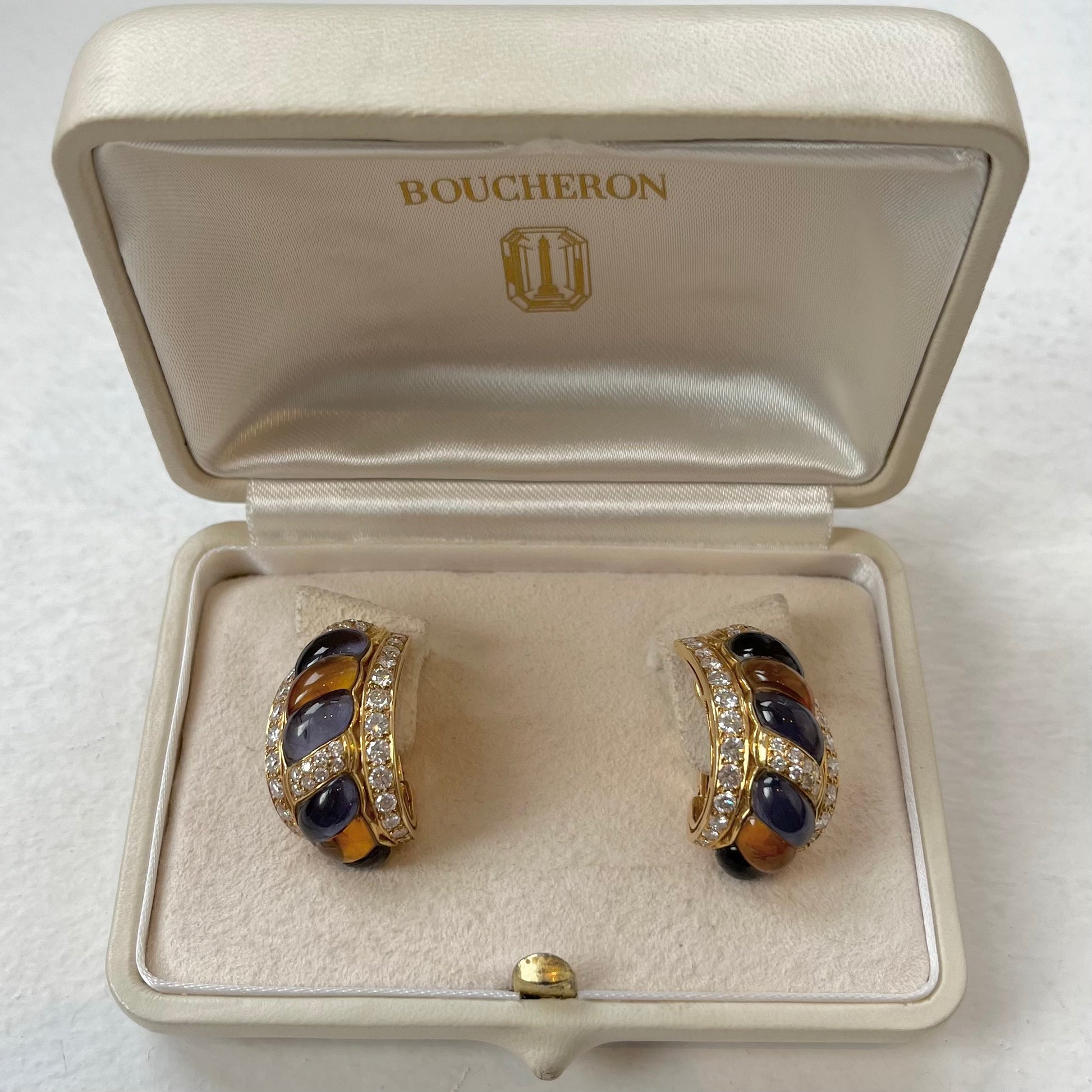 A pair of Boucheron gold, diamond, iolite and citrine ear clips. Each designed with a central stylised rope twist band of alternating blue and yellow carved cabochons. Around the border it is lined with brilliant-cut diamonds. Stamped with French hallmarks with Original makers case. Signed 'Boucheron' and numbered.