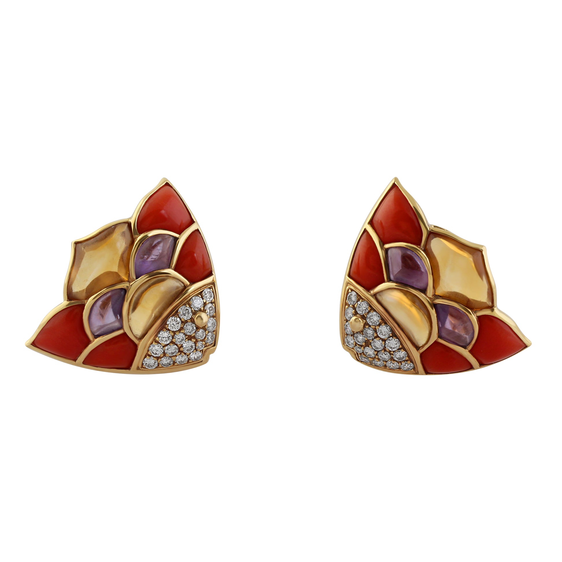 A set by Bulgari, in 18KT gold, diamonds, coral, onyx, citrine and amethyst comprising of a pair of earrings and a bracelet from the "Naturalia" collection. Circa 1980.