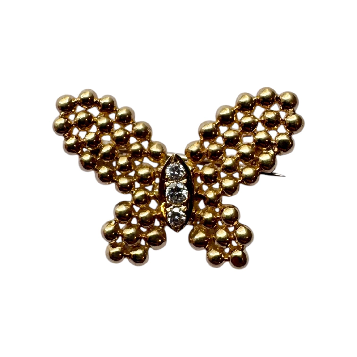 A rare Perlée 18KT gold and diamond butterfly brooch by Van Cleef & Arpels. Gold beads form the wings of the butterfly with three graduated round brilliant cut diamonds set in the thorax. Signed VCA and numbered and stamped with French control marks and the maison's workshop mark. 2.8 x 2cm.