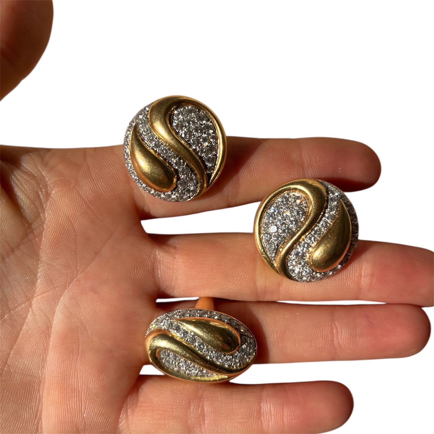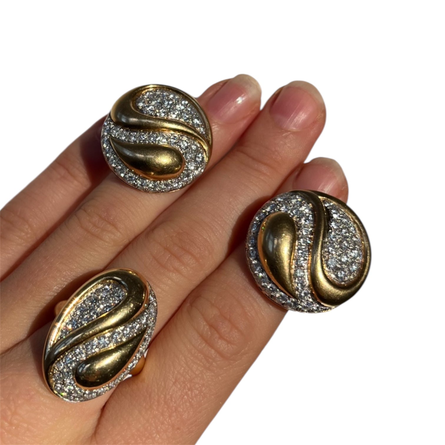 A Van Cleef & Arpels set comprised of a pair of earclips and a matching ring in 18 KT gold. Designed in a Taijitu motif, otherwise known as "Yin Yang", pavé-set with brilliant-cut diamonds. Bearing French hallmarks and export marks, signed VCA NY and numbered. Circa 1980.